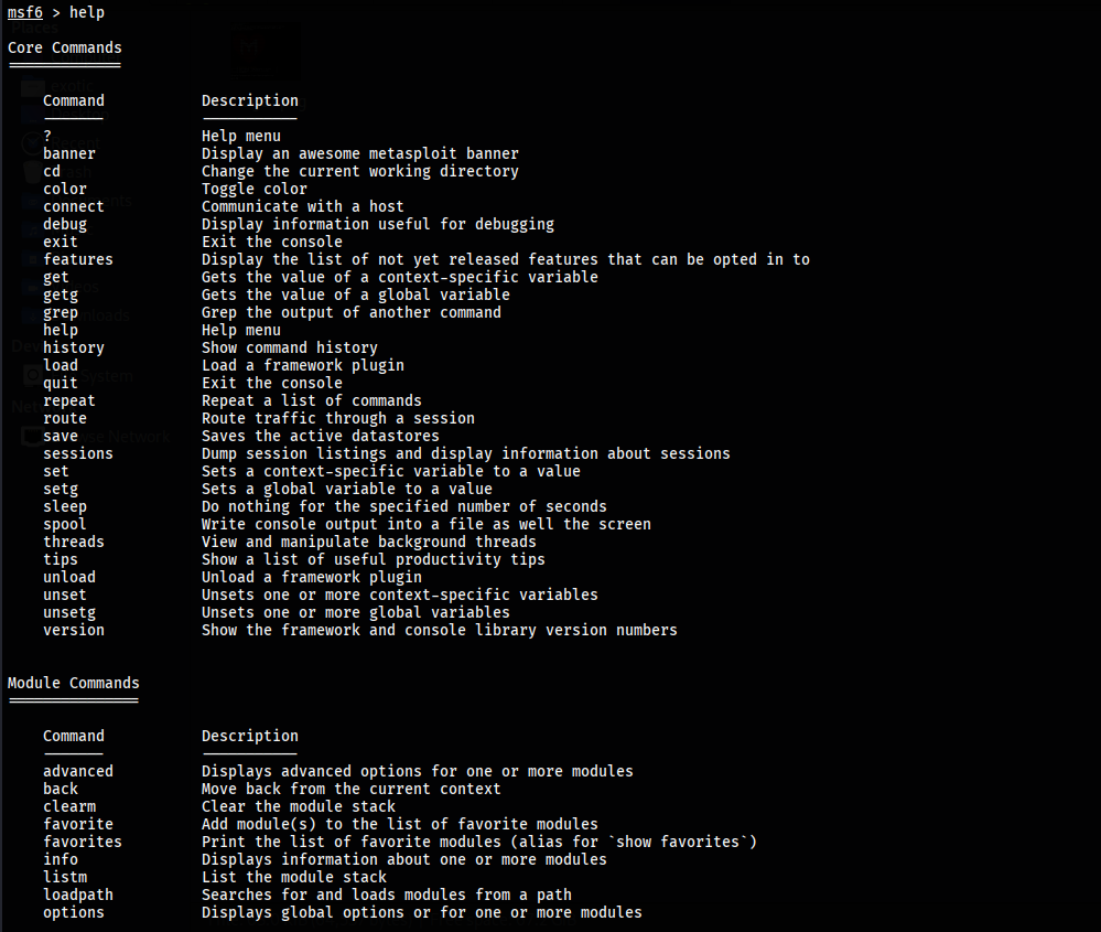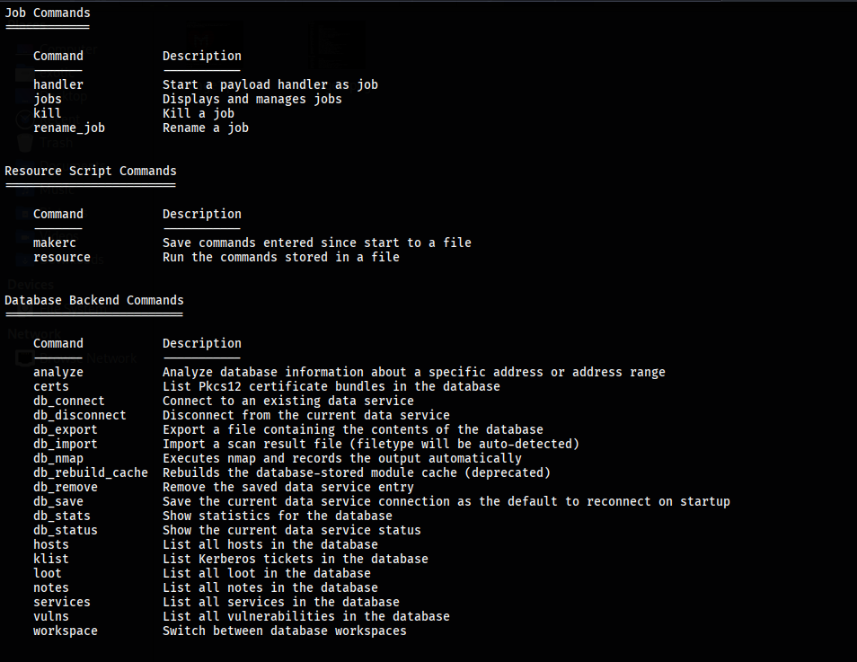 After starting the Metasploit framework, we can check for the basic commands by using “help” command.