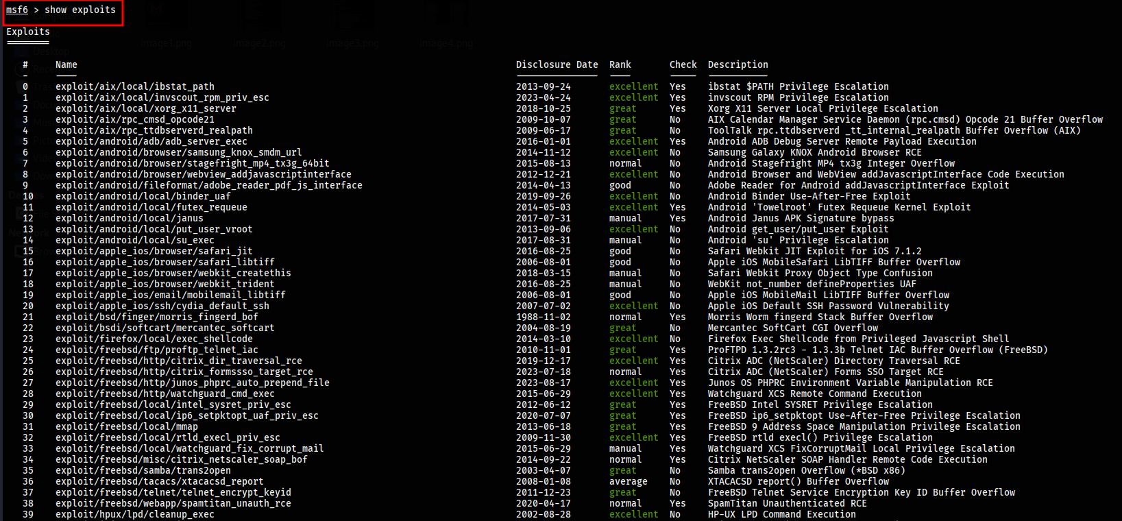 To view all exploits available in the Metasploit framework, use the command show exploits. This command lists all exploits alphabetically, along with their disclosure date and rank, which ranges from “Excellent” to “Average”.